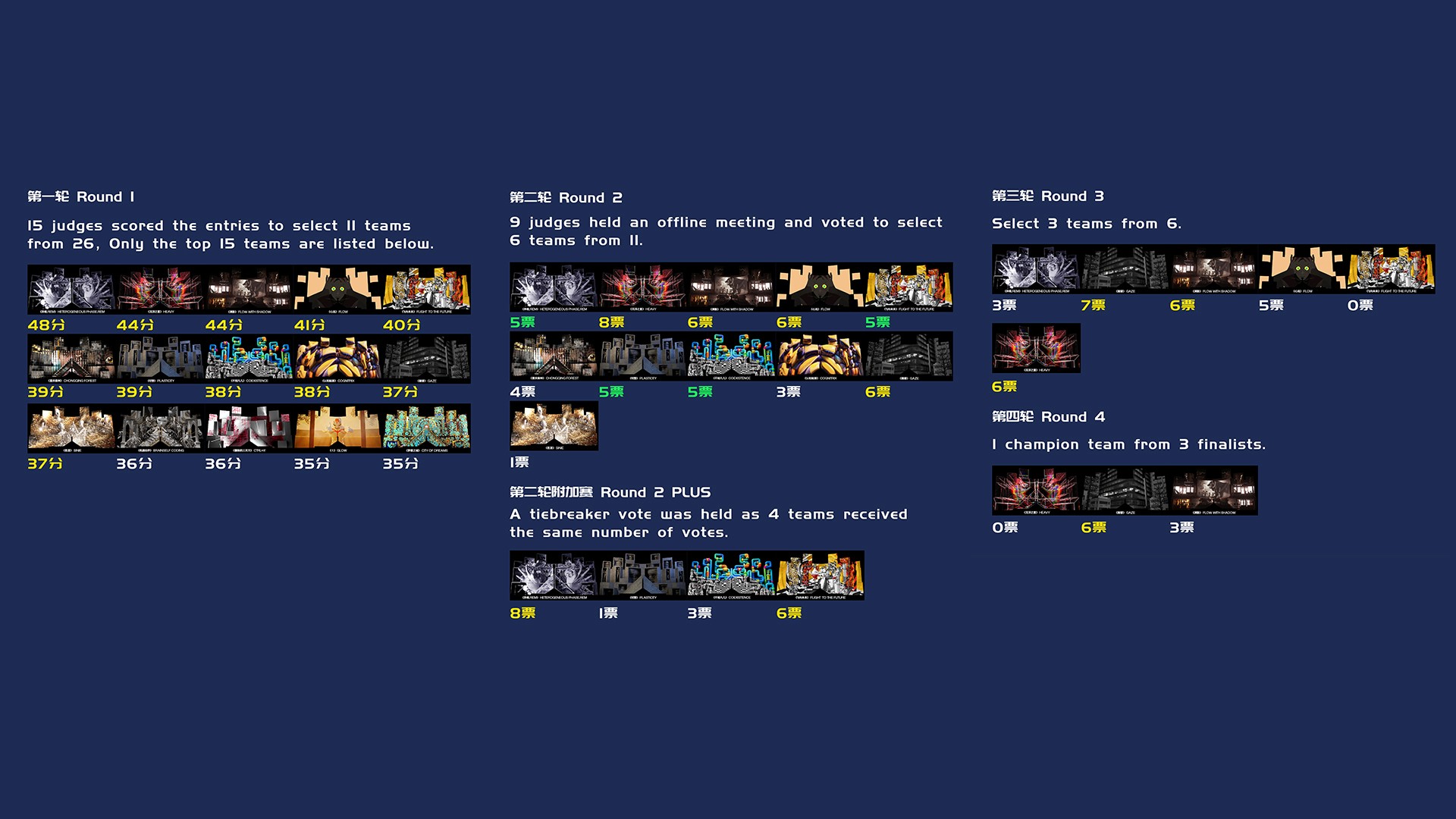 The final evaluation consisted of four stages. In the first round, 15 judges scored the entries and selected 11 teams to advance; in the second round, the judges voted offline to select 6 teams, with a tiebreaker held due to an equal score; in the third round, 3 teams were chosen from the 6 to enter the final competition; in the fourth round, the Gold Award winner was selected from the 3 teams, and the final awards were confirmed.